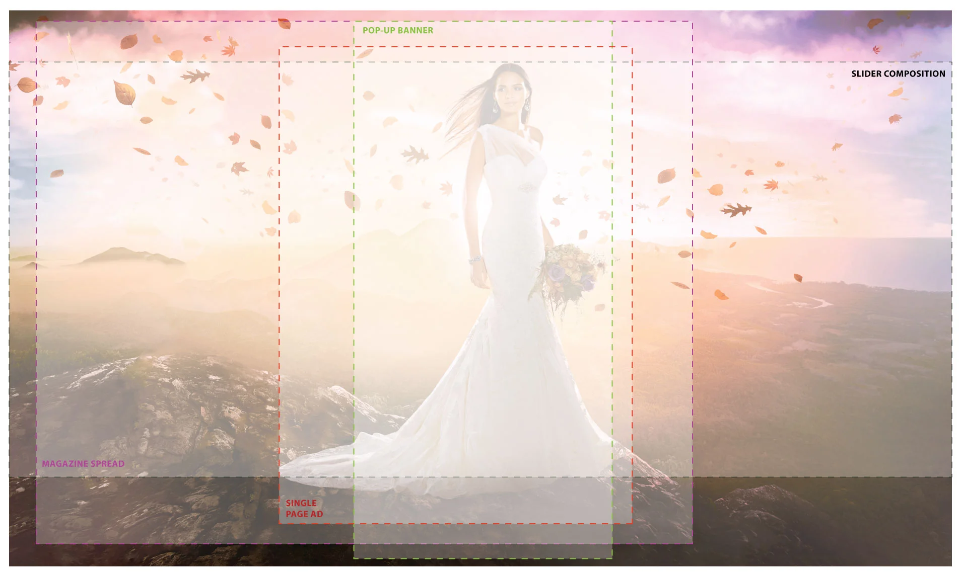 My approach to this brand involved a great amount of composite work to produce something visually unique for the bridal industry. In order to get both internal and Disney approvals, I created a deck containing every princess, her proposed image, and the reasoning behind the image. This practice ultimately became the go-to approach to Disney for the next 3 years in order to expedite final approvals as well as help guide hired talent to achieve the expected images.
