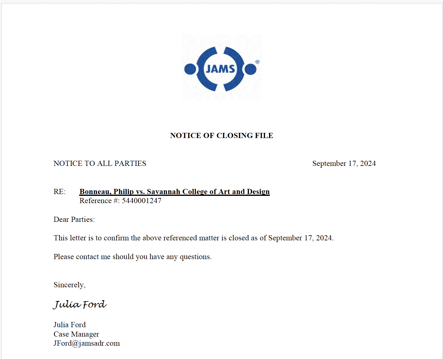 I submitted my response to them, the JAMS system online and to SCAD Legal of official Submit.
